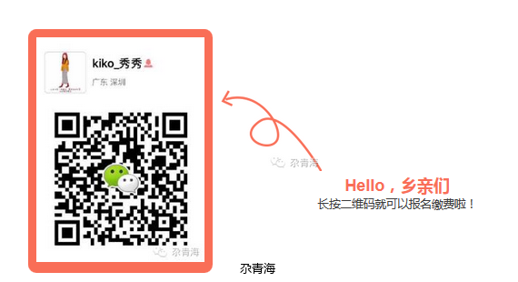 3、本次活动因参与人数较多,场地有限,我们杜绝一切放鸽子和空降,采用提前收费制,请参与的乡亲将会费以微信红包或转账的方式缴纳到年会财务负责人 祁堃-秀秀(微信见下)处。若报名且已缴费,即时发生无故放鸽子行为,费用不予退还,将作为会费开支。
